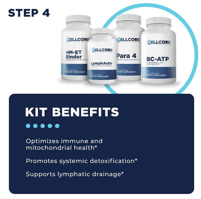 STEP 4 Systemic Detox: Step 4 picks up where Step 3 left off to continue promoting systemic detoxification and healthy drainage pathways with BC-ATP, HM-ET Binder, LymphActiv, and Para 4. BC-ATP returns to optimize energy production and mitochondrial health, while the other three products are introduced to the protocol for the first time.
