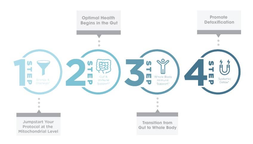 STEP 1 Energy & Drainage: The products in Step 1 deliver key nutrients for optimizing mitochondrial health and establishing healthy drainage pathways — both of which are essential before promoting periods of detoxification. This also helps make the detox process smoother and encourages sustained energy as your patient or client moves through the protocol
