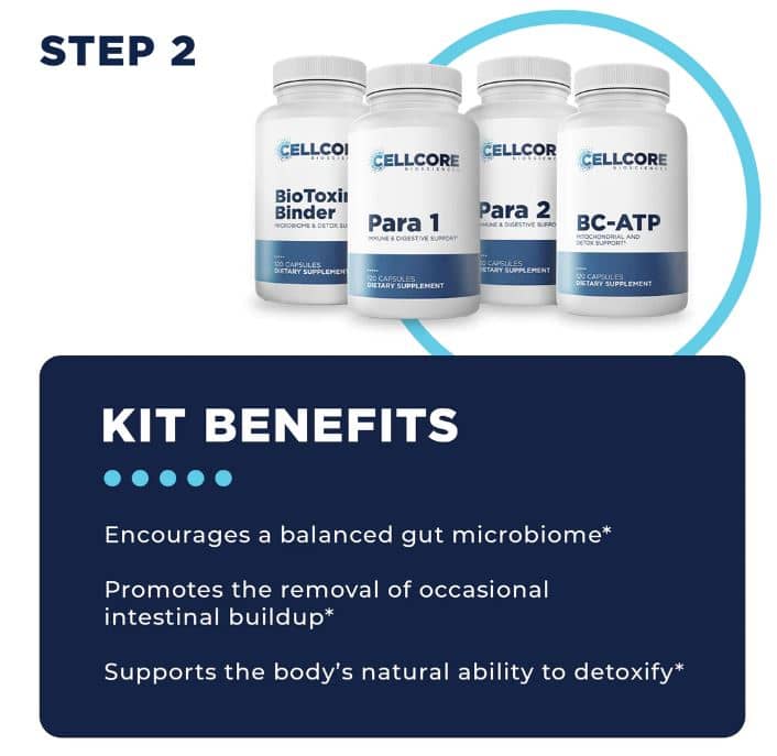 STEP 2 Gut & Immune Support: After optimizing ATP production and healthy drainage pathways in Step 1, Step 2 focuses on promoting the body’s natural detoxification processes and nurturing the gut microbiome. Step 2 consists of BC-ATP, BioToxin Binder, Para 1, and Para 2. Para 1, our flagship gut and immune support supplement (made from 100% pure Mimosa pudica seed), encourages the removal of occasional intestinal buildup.